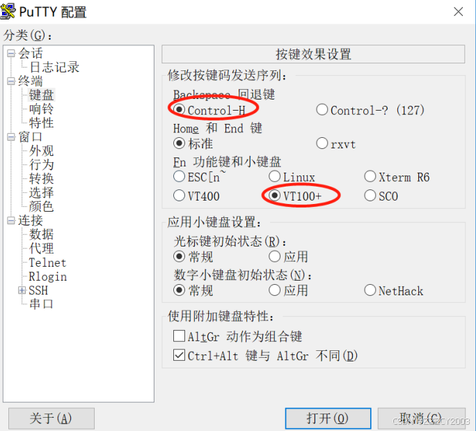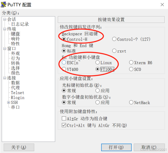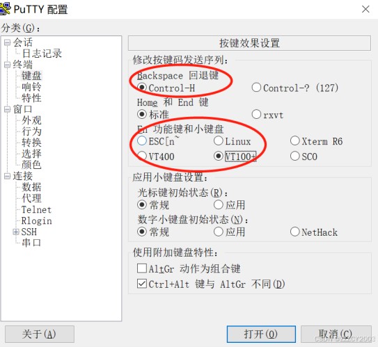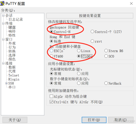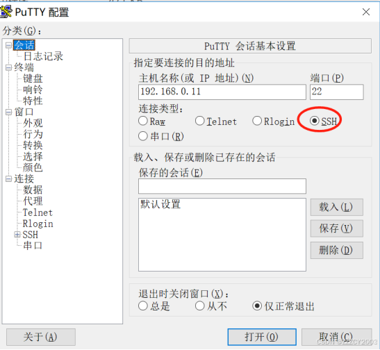 通过 putty 软件登录设备,输入设备的 IP 地址,选择协议类型为 SSH,设置键盘参数