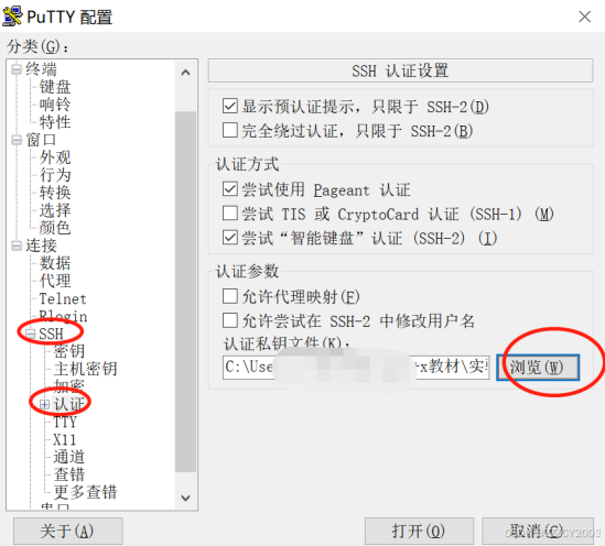 在 putty 软件上,按“SSH——认证”打开认证选择界面,单击“浏览”按钮选择步骤 7 保存 的私钥文件“private.ppk”