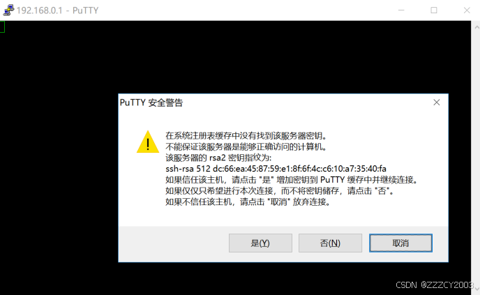 单击“打开”按钮,首次登录时,在弹出的安全警告界面选择信任主机“是(Y)”