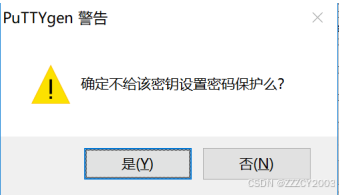 密钥生成后如上图所示,点击“保存公钥”,文件名为“public.pub”。然后再点击“保存 私钥”,在弹出的对话框中,选择“是”,保存文件名为“private.ppk”