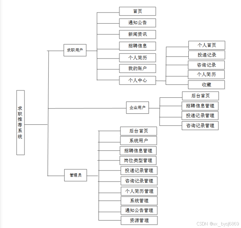 按照求职推荐系统的角色划分为求职用户模块,企业用户模块和管理员模块这三大部分。