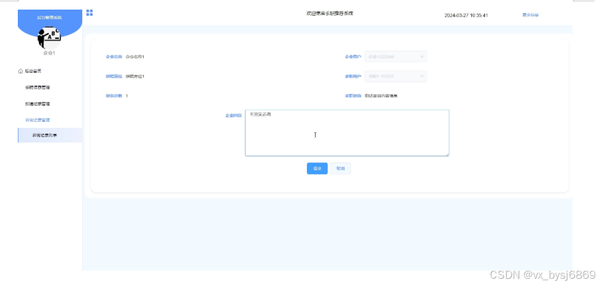 - 咨询记录管理:企业用户可以查看和管理求职用户提交的咨询企业信息,并对咨询进行回复。