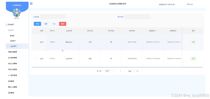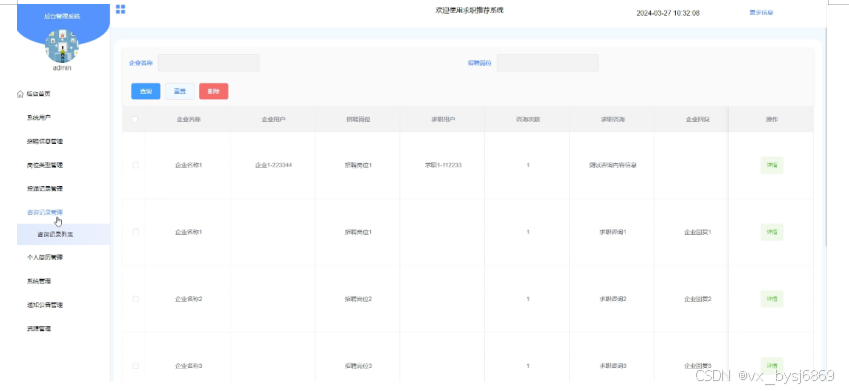 - 系统用户:管理员可以对求职用户、企业用户、管理员等系统用户信息进行增删改查操作。