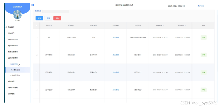 - 个人简历管理:管理员可以查看所有个人简历信息,进行查询和删除操作。