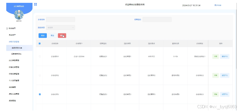 - 招聘信息管理:企业用户可以查看自己的招聘信息,进行增改删查操作。