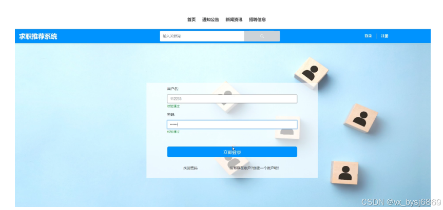 前台用户模块主要为求职用户模块,实现了用户注册、登录、首页、通知公告、新闻资讯、招聘信息、个人简历、我的账户、个人中心(个人首页、投递记录、咨询记录、个人简历、收藏)等功能。