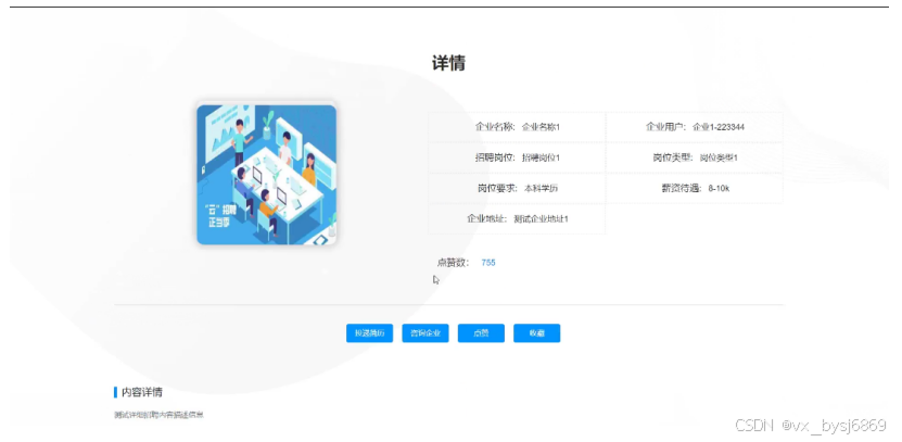 - 招聘信息:用户可以查看企业发布的招聘信息,可以查看某一求职招聘信息的详情,并可以进行投递简历和咨询企业操作。