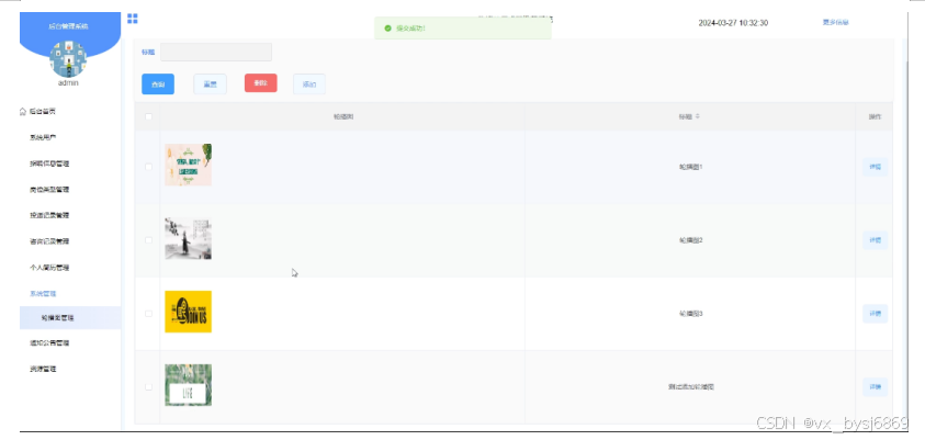 - 系统管理:管理员可以查看系统前台轮播图的详情信息,进行增删查操作。