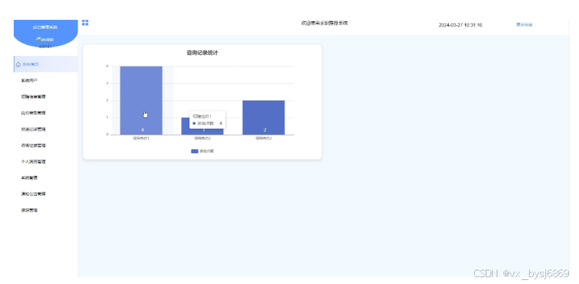 - 后台首页:管理员可以查看咨询信息统计数据分析图表。