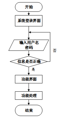 用户首先进入系统登录界面,输入用户名和密码后,系统验证信息是否正确。若验证失败,返回登录界面重新输入;若验证成功,则进入功能界面,执行相应功能处理后结束操作流程。操作流程如图所示。