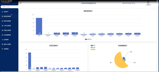 - 后台首页:管理员可以直观查看系统概览,包括用户活跃度、订单统计、猫咪信息概览等关键数据。