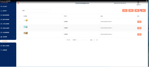 - 系统管理:管理员能够全面掌控系统配置,包括轮播图的查询、重置、删除、添加以及详情查看,确保系统界面的美观性和信息的时效性,提升用户体验。