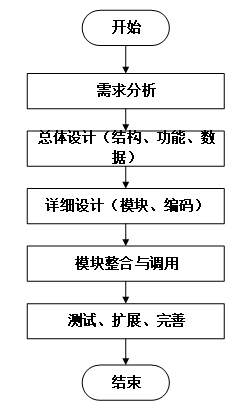 系统开发流程的主要步骤,从需求分析到系统完成的全过程。流程包括需求分析、总体设计(结构、功能、数据)、详细设计(模块、编码)、模块整合与调用,以及测试、扩展和完善,最终完成系统的开发。本系统的开发流程如图所示
