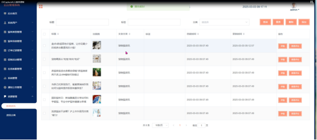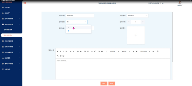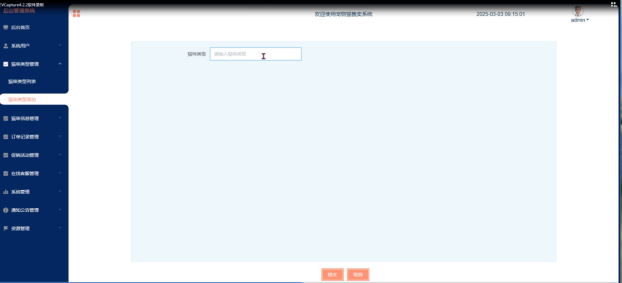 - 猫咪类型管理:管理员可以灵活定义和编辑猫咪类型,包括查询现有类型,重置类型信息,删除不再需要的类型,添加新类型,以及查看类型的详细信息,以适应平台发展和用户需求变化。