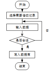 用户首先选择需要修改的记录,输入修改后的数据,系统判断输入数据是否合法。若数据不合法,提示重新输入;若数据合法,则将修改后的数据写入数据库,完成操作后流程结束。修改信息流程图如图所示。