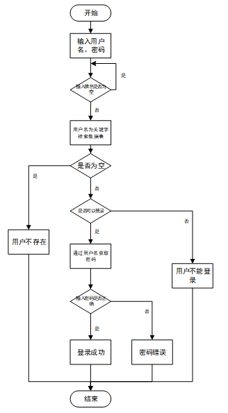 用户输入用户名和密码后,系统先检查输入是否为空,再验证用户名是否存在,若存在则通过用户名获取密码并校验。若密码正确则登录成功,否则提示密码错误。若用户名不存在或无法登录,提示用户操作无效。如图所示。