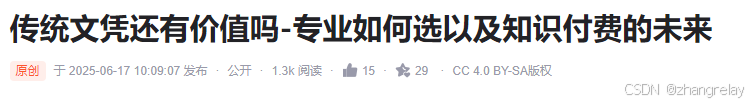 当信息时代向智能时代加速跨越,教育领域正经历一场前所未有的范式危机。CSDN 博主 ZhangRelay 于 2025 年 6 月发布的《传统文凭还有价值吗 - 专业如何选以及知识付费的未来》,以犀利的视角直击传统教育的核心困境,抛出了 “文凭变现价值弱化”“专业选择认知升级”“知识付费行业转型” 等关键命题。而 “传统教育已经没落”“企业将成中学生升学理想地” 的补充观点,更将这场讨论推向了更具颠覆性的维度 —— 这不仅是对教育形式的质疑,更是对 “如何培养适应智能时代人才” 这一根本问题的深刻反思。