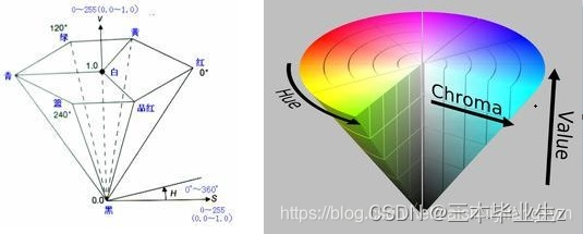 和RGB色彩空间相比,在图像处理中使用较多的是HSV色彩空间,它比RGB更接近人们对彩色的感知经验。能够非常直观地表达颜色的色调、鲜艳程度和明暗程度,方便进行颜色的对比。HSV是由A. R. Smith在1978年创建的一种颜色空间模型,也称六角锥体模型。在HSV模型中表示颜色的参数分别是:色度(Hue)、饱和度(Saturation)、亮度(Value)。在RGB色彩模型中,一个颜色需要有R、G、B三个值共同决定,在HSV色彩模型中,则只需要H即可。