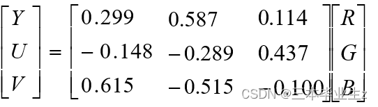 为了使用人的视角特性以降低数据量,通常把RGB空间表示的彩色图像变换到其他彩色空间。目前采用的彩色空间变换有三种:YIQ, YUV和YCrCb。 同时,由于人眼对色度的敏感程度要低于对亮度的敏感程度,在使用YUV的时候,保证Y分量的前提下,可以舍弃一部分UV分量,来减少对存储带宽的需求,也并不会对图像的质量有太大影响。每一种彩色空间都产生一种亮度分量信号和两种色度分量信号,而每一种变换使用的参数都是为了适应某种类型的显示设备。其中,YIQ适用于NTSC彩色电视制式,YUV适用于PAL和SECAM彩色电视制式,而YCrCb适用于计算机用的显示器。
