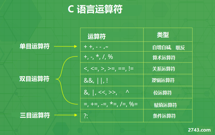 C语言运算符 对于含多个关系运算符的表达式, 如 k==j==i+5,根据运算符的左结合性,先计算 k==j,该式不成立,其值为 0,再计算 0==i+5,也不成立,故表达式值为 0。5>0 的结果是 1, 为真, 4>2 结果是 1, 也为真, 所以相与的结果为真, 也就是 1。4>0 的结果是 1, 为真, 5>8 的结果是 0, 为假, 所以相或的结果为真, 也就是 1。5>0 的结果是 1, 为真, 非运算的结果为假, 也就是 0。1为真, 0 为假, 相与的结果为假, 也就是 0。:, 我们将在《C 语言。