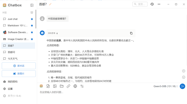 新建对话->输入问题可以看到正常运行