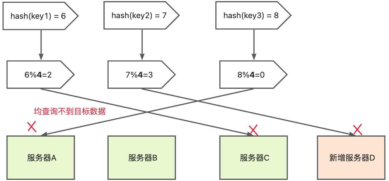 当业务流量突增数据变多,三台服务器已经无法承载量级时,就需要增加服务器数量,服务器数量从3变成了4,那么hash函数就变成了:hash(key)%4,此时再看上述场景,计算后得到的目标服务器大多数都会发生变化,之前缓存的数据就会失效。如下图: