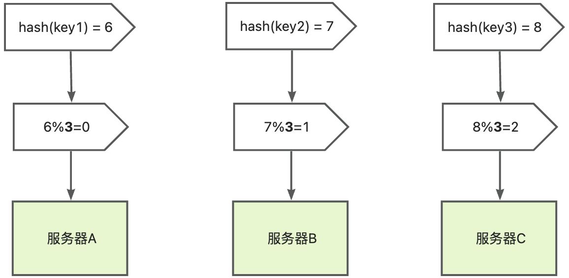 这样对3取模之后的结果一定是 0、1、2,可以分别对应机器A、B、C 刚好达到数据的均匀分布