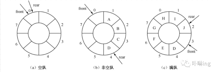 如图所示的图为元素 A、B、C 出队,元素 E、F、G、H、I、J 依次入队后队满的情况。此时 front = 3 , rear=2 , 两者比较的结果为(rear+1)%MAXSIZE== front (即(2+ 1)% 8 == 3 ) , 所以循环队列为满。