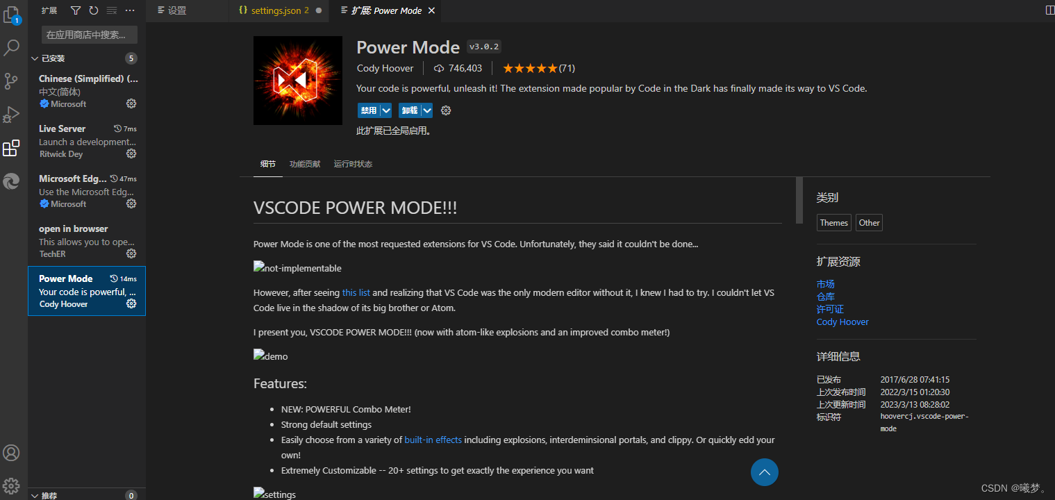 vs code敲代码特效完整调试 /效果样式 “水花-particles”, “烟花-fireworks”, “火焰-flames”, “雪花-magic”, “幽灵-clippy”, “激光-simple-rift”, “大激光-exploding-rift”4,有时代码编辑区会含有这样一行代码,会导致所做的设置不生效,我们只需将其注释掉即可,可以选中要注释的区域按Ctrl+?5,但敲代码时默认会有代码抖动和右上角计数的效果,可以输入以下几行代码清除。2,安装完成后,单击卸载右边的管理,选择扩展设置。// 去除右上角计数。