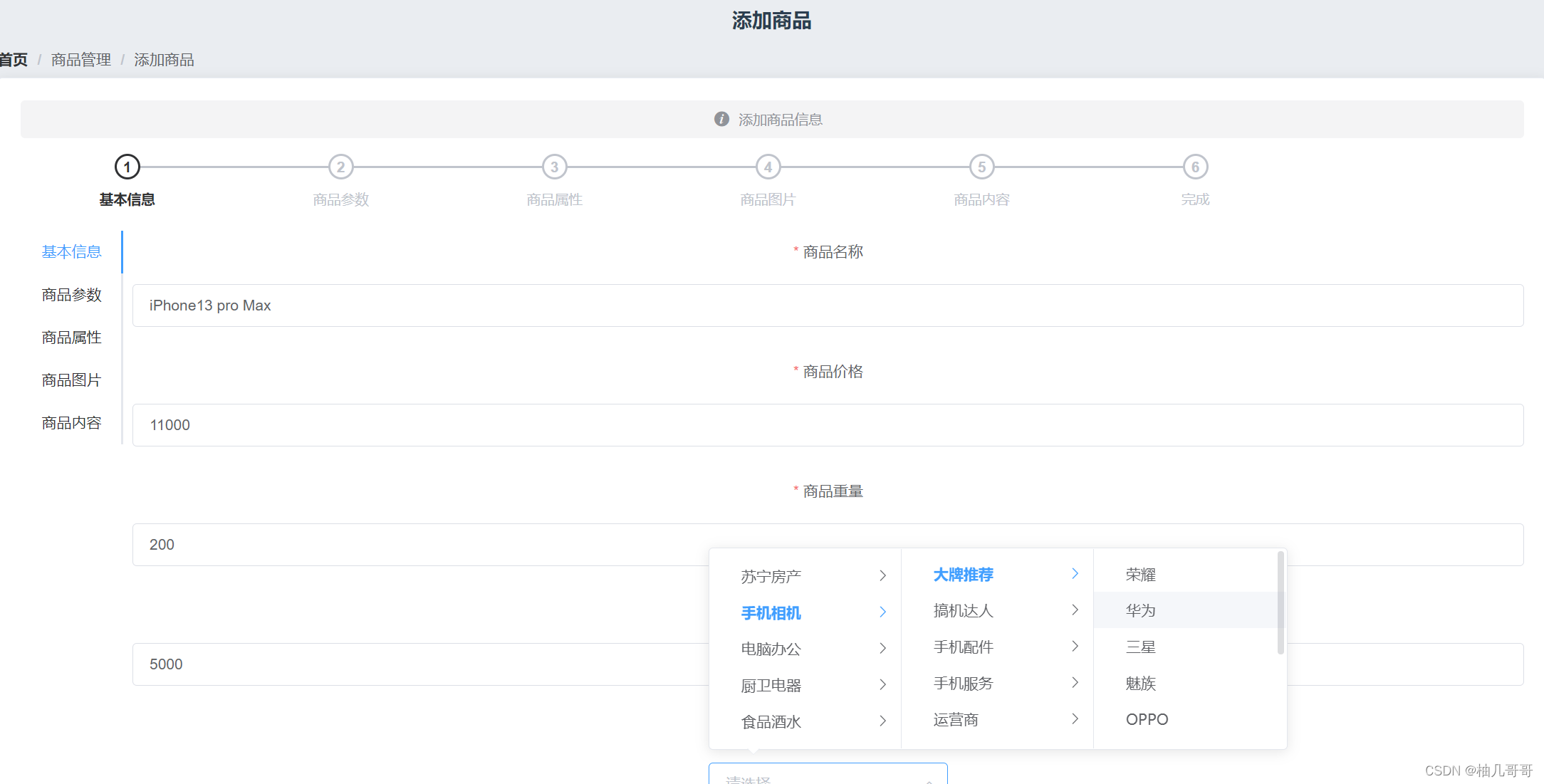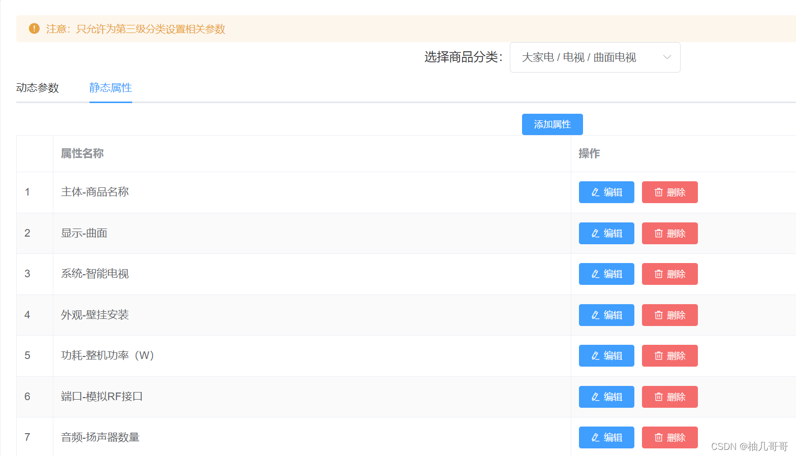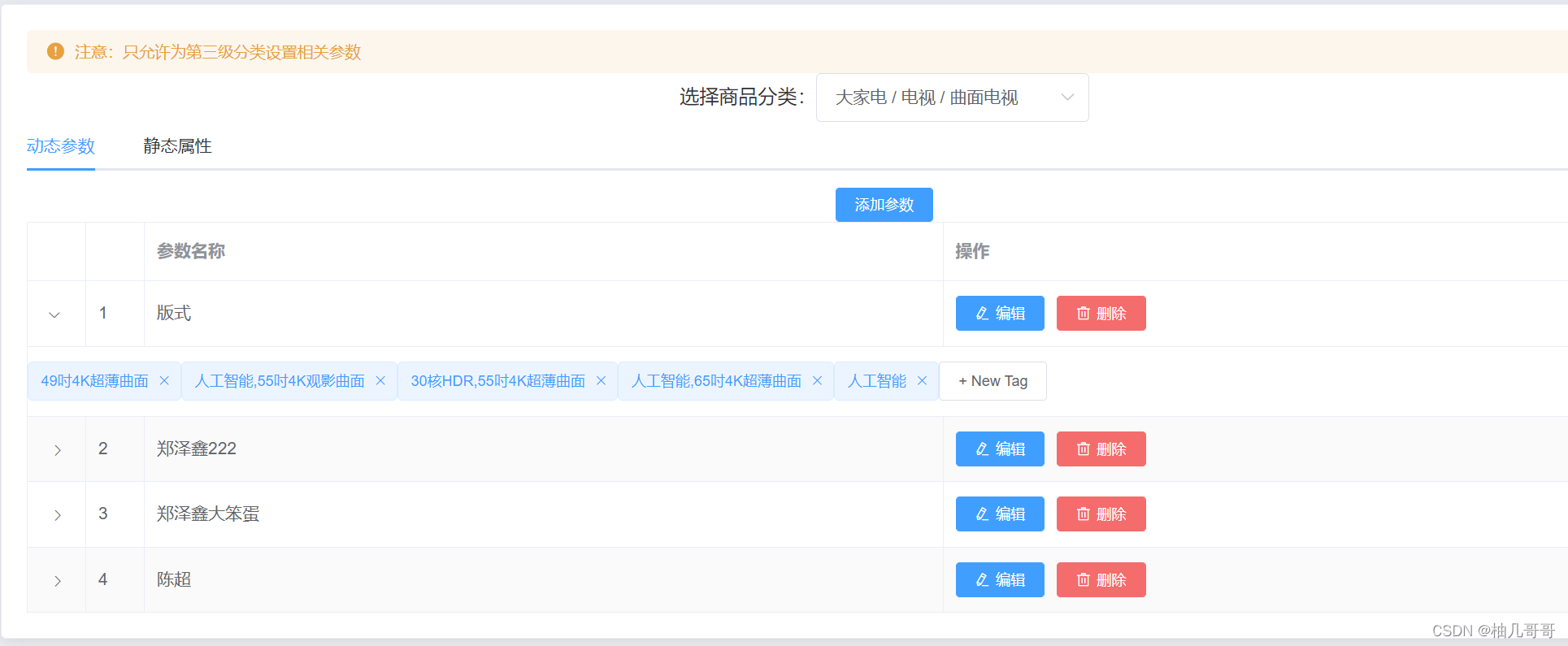 分类参数:负责查看、修改、删除商品分类的动态参数和静态属性