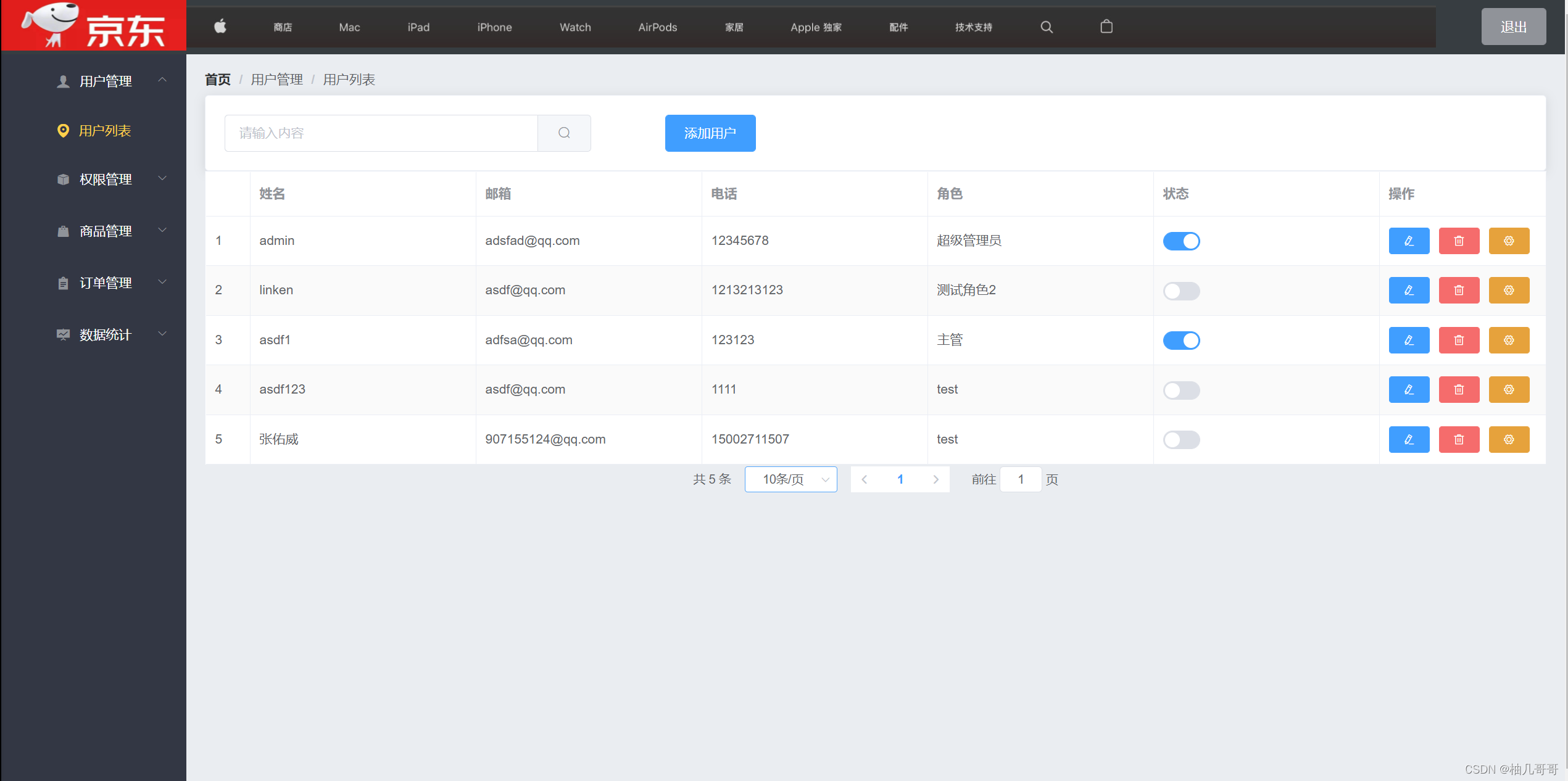 管理员可进入:实现模糊搜索、多条件分页、添加用户、编辑用户信息、删除、分配用户角色等功能。