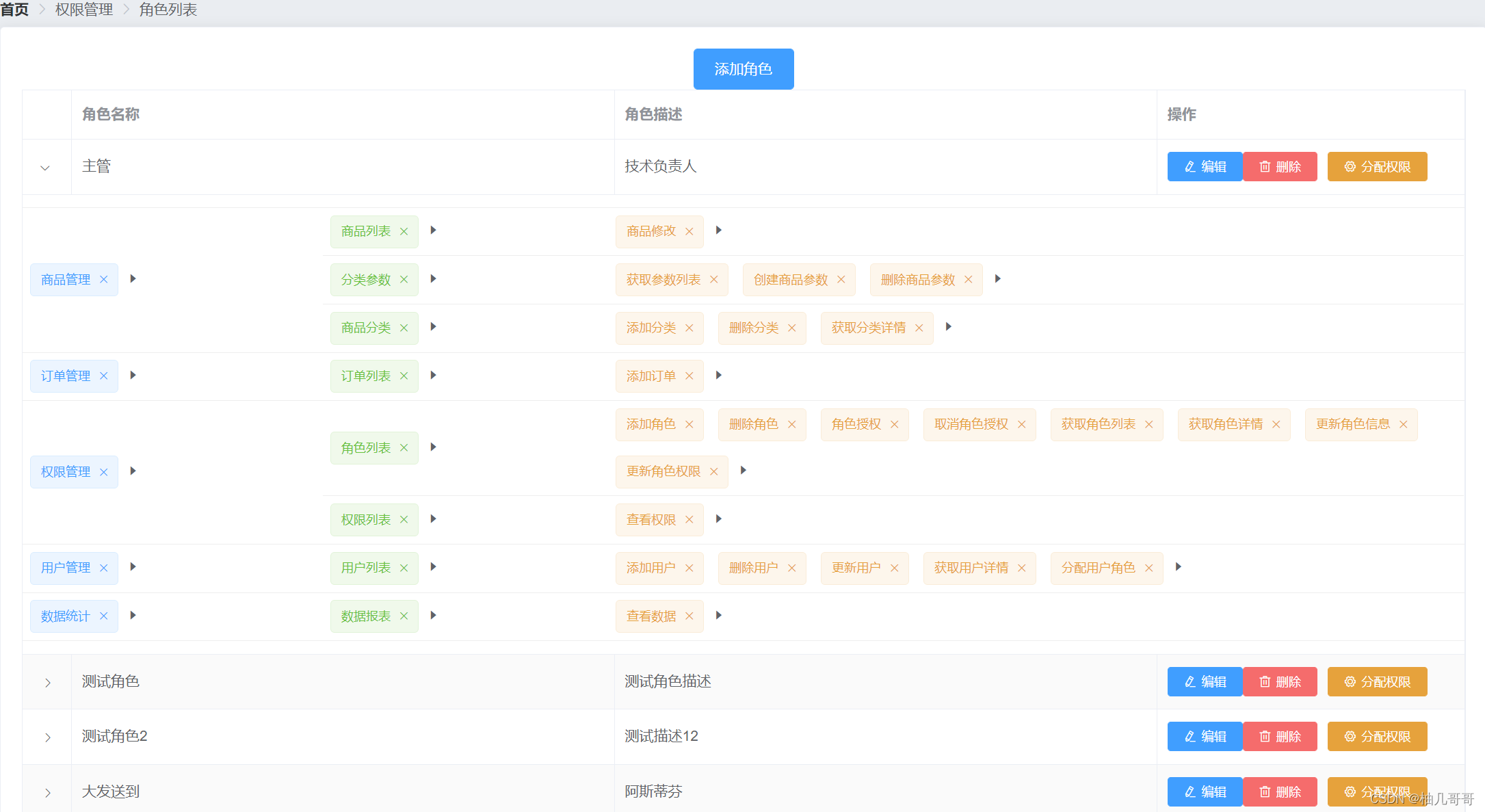角色列表:可通过树状结构,查看、添加、修改、删除不同层级的权限可访问的菜单项。