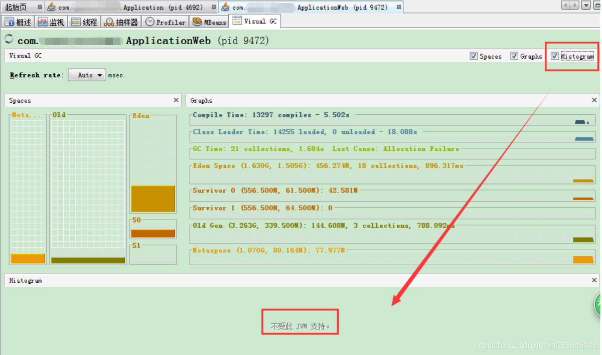 重启visualVM,监控Web,因为web采用默认vm配置,默认的gc策略不支持Hisogram