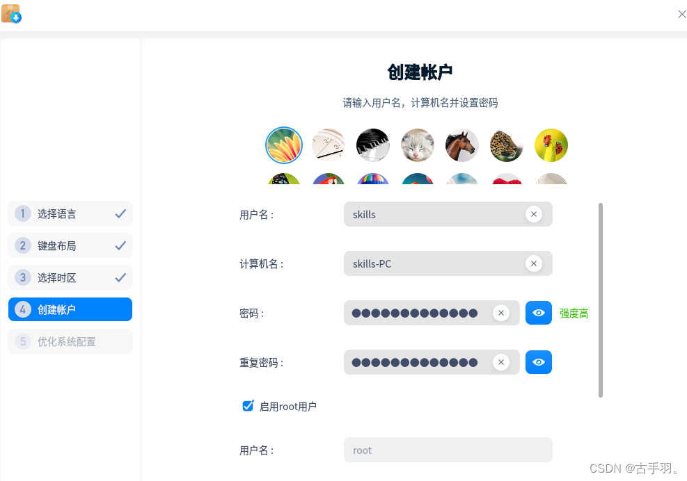 这里到了创建账户界面(由于系统要求密码强度高,我们需要牢记自己的密码)
