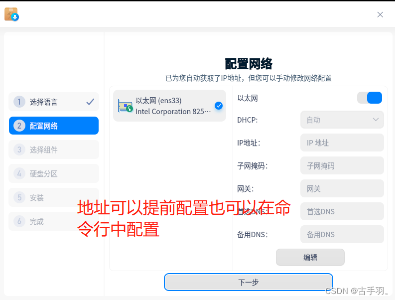 这里是配置网络信息的,可以选择在安装系统过程中配置也可以选择在安装后配置。