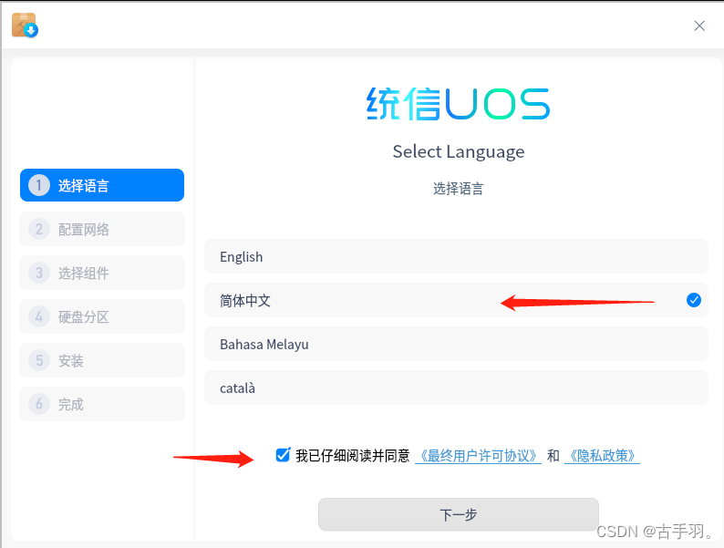 这里我们选择统信UOS的语言 我选择的是简体中文。(英文不好嘿嘿!)