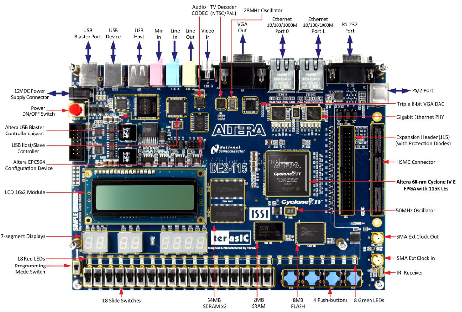 DE2-115配有八个七段数码管。它们被分成两组,每组4个,用来作为数字显示用。DE2-115的七段数码管采用共阳极连接方式。FPGA输出低电平时,对应的字码段点亮,反之则熄灭。要注意的是:在DE2-115开发板上七段数码管的点是不可用的。