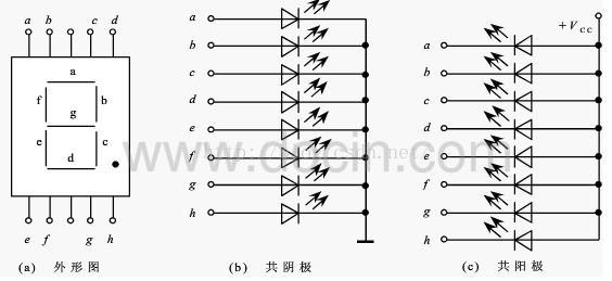 七段数码管一般由8个发光二极管组成,其中由7个细长的发光二极管组成数字显示,另外一个圆形的发光二极管显示小数点。 当发光二极管导通时,相应的一个点或一个笔画发光。控制相应的二极管导通,就能显示出各种字符。发光二极管的阳极连在一起的称为共阳极数码管,此时译码器的输出应该是低电平有效;阴极连在一起的称为共阴极数码管,此时译码器的输出应该是高电平有效。如图2-25所示。