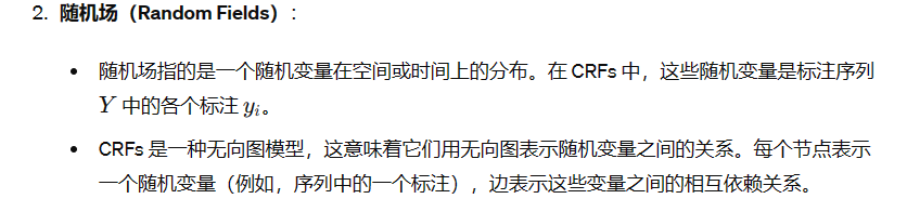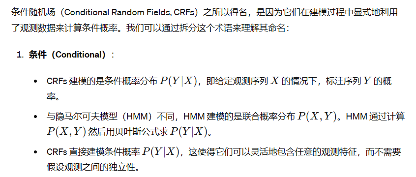 条件随机场(CRFs)之所以被称为“条件随机场”,是因为它们通过条件概率分布 𝑃(𝑌∣𝑋) 直接建模观测序列 𝑋和标注序列 𝑌之间的关系,并且使用无向图表示随机变量(标注)之间的依赖关系。这种方法可以更好地捕捉观测序列中的上下文信息,并灵活地包含多种特征,从而在序列标注等任务中提供更准确的结果。