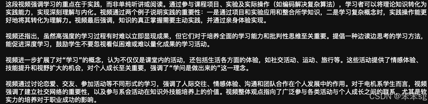 确实,目前我们生成的摘要并没有包含具体的时间戳信息,不像一些评论区的 AI 小助手那样,为每个摘要段落提供对应的视频时间点。这是因为我们在 extract_and_save_text() 处理的时候就把时间戳信息拿掉了,为什么这样做呢?