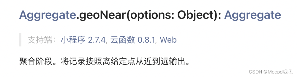 私活还是那个私活,功能还是那么嗯嗯啊啊,功能要求获取用户到站点的距离,本来想用腾讯地图的api,今天一看小程序云开发文档,云数据库聚合aggregate中有一个geoNear的方法,可以返回两点间距离。这不是就解决了嘛~事情当然不会那么简单......要是这么简单我还写什么(我还怎么水文章啊)