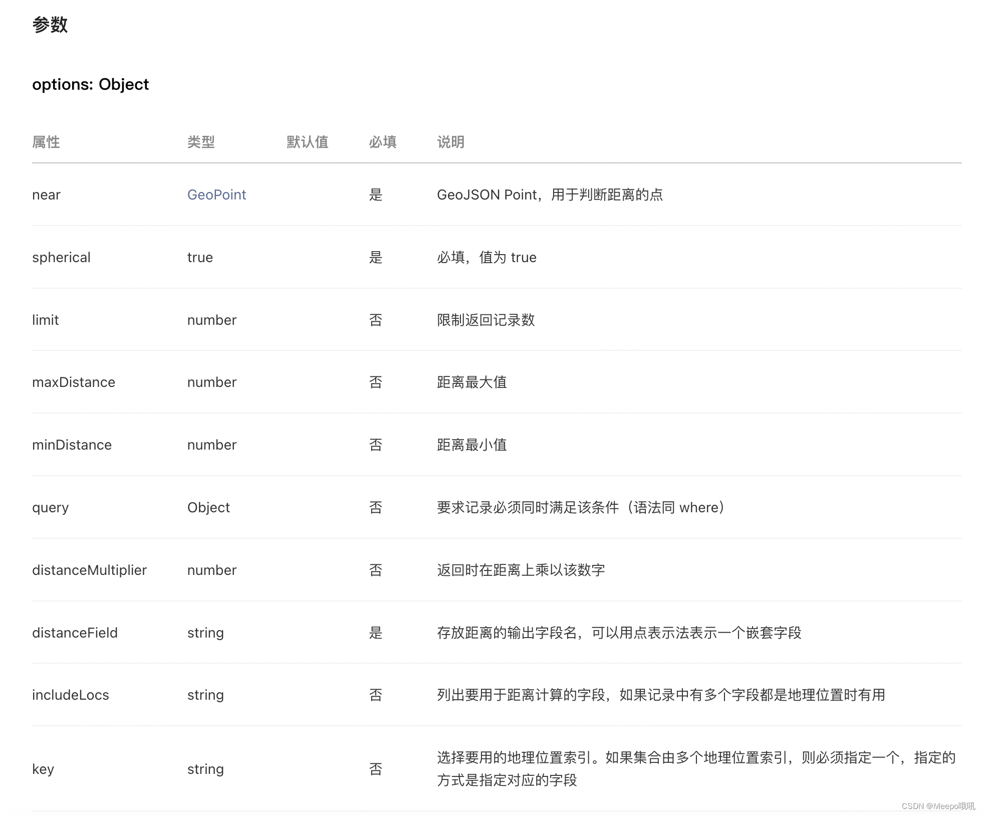 distanceField: 'distance',// 距离的字段名,最后计算出的距离会放在这个字段中,单位米