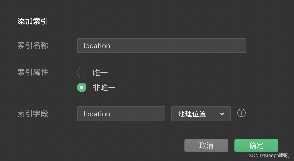 - 添加索引,填写索引名称和索引字段,选择为地理位置