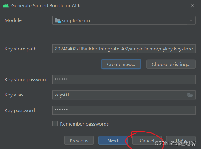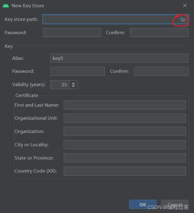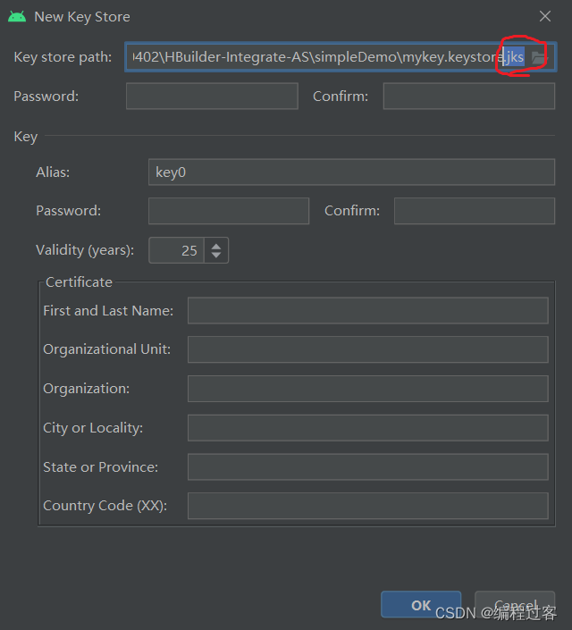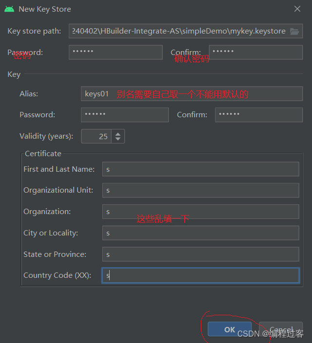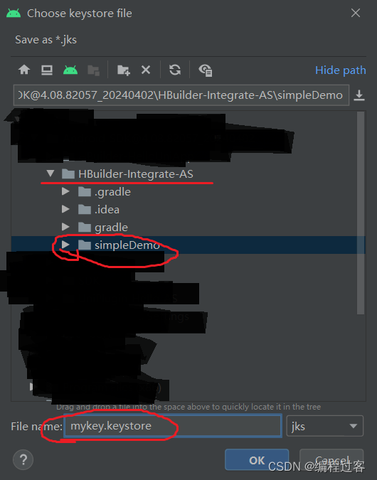 建议路径选择SDK离线包的simpleDemo里(不容易乱),名称就叫mykey.keystore