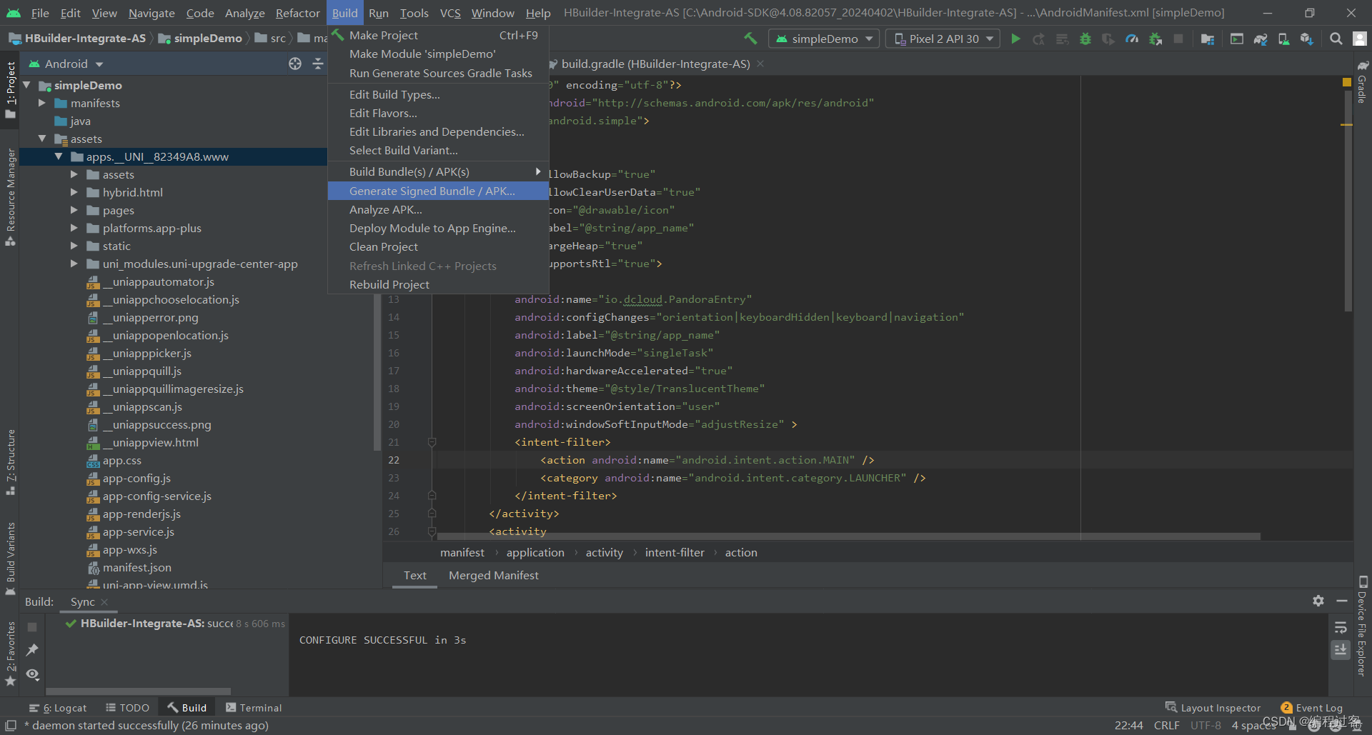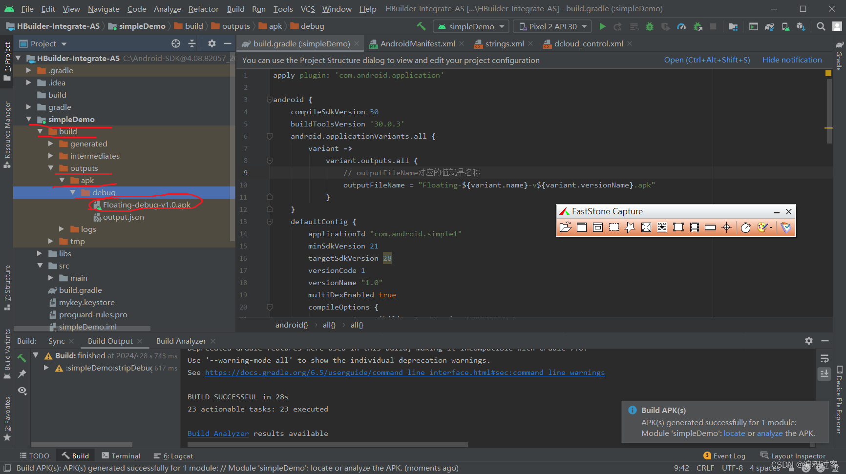 最后会在simpleDemo里生成一个build文件夹,生成的APK就放在里面的outputs->apk->debug->xxx.apk