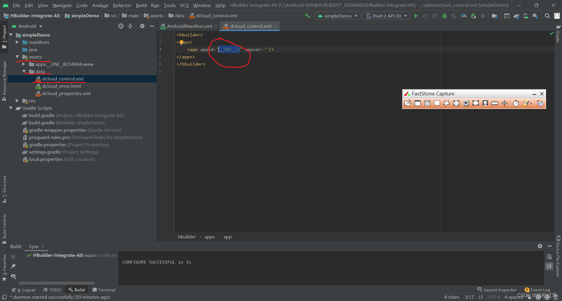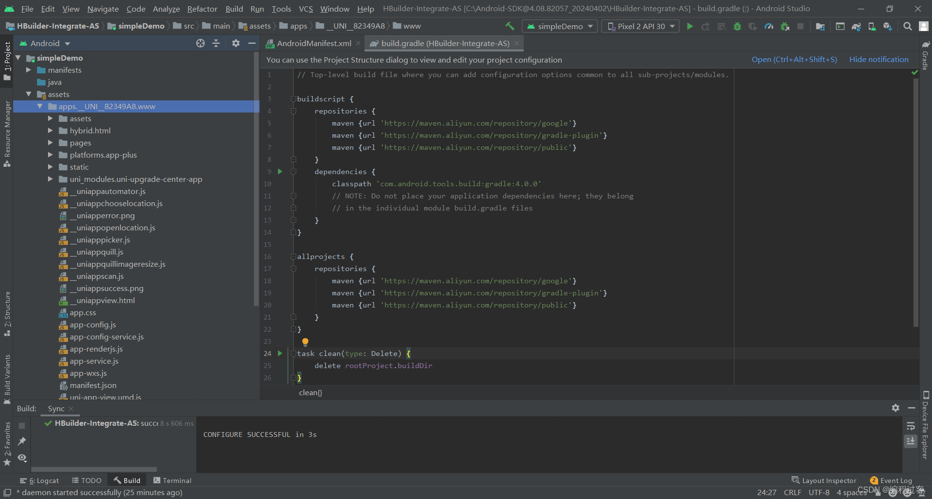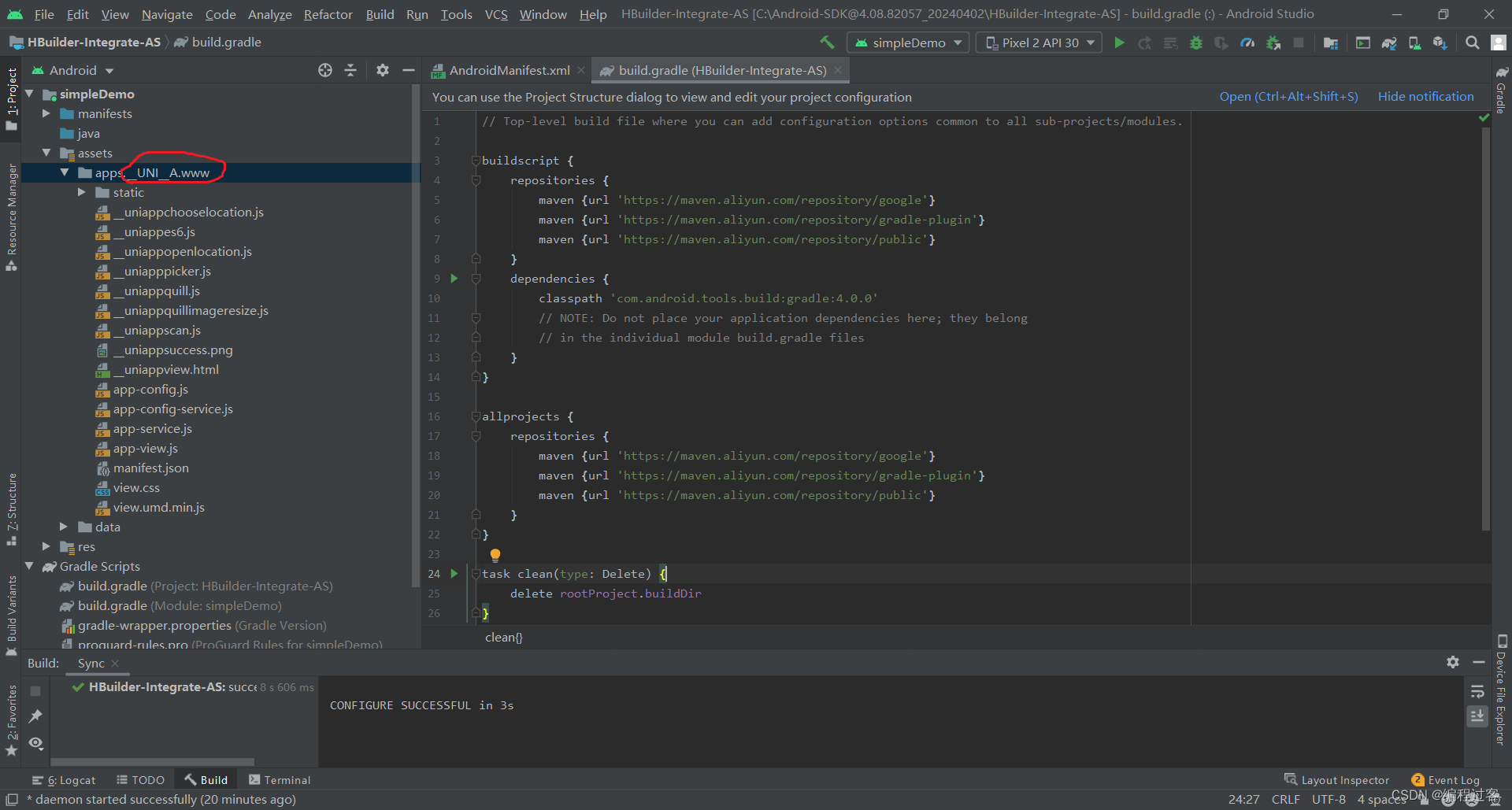 然后去AndroidStudio里将simpleDemo目录下的src->main->assets->apps文件下的__UNI__……文件删除(注意apps文件不要删,要删的是带__UNI__前缀的文件夹)