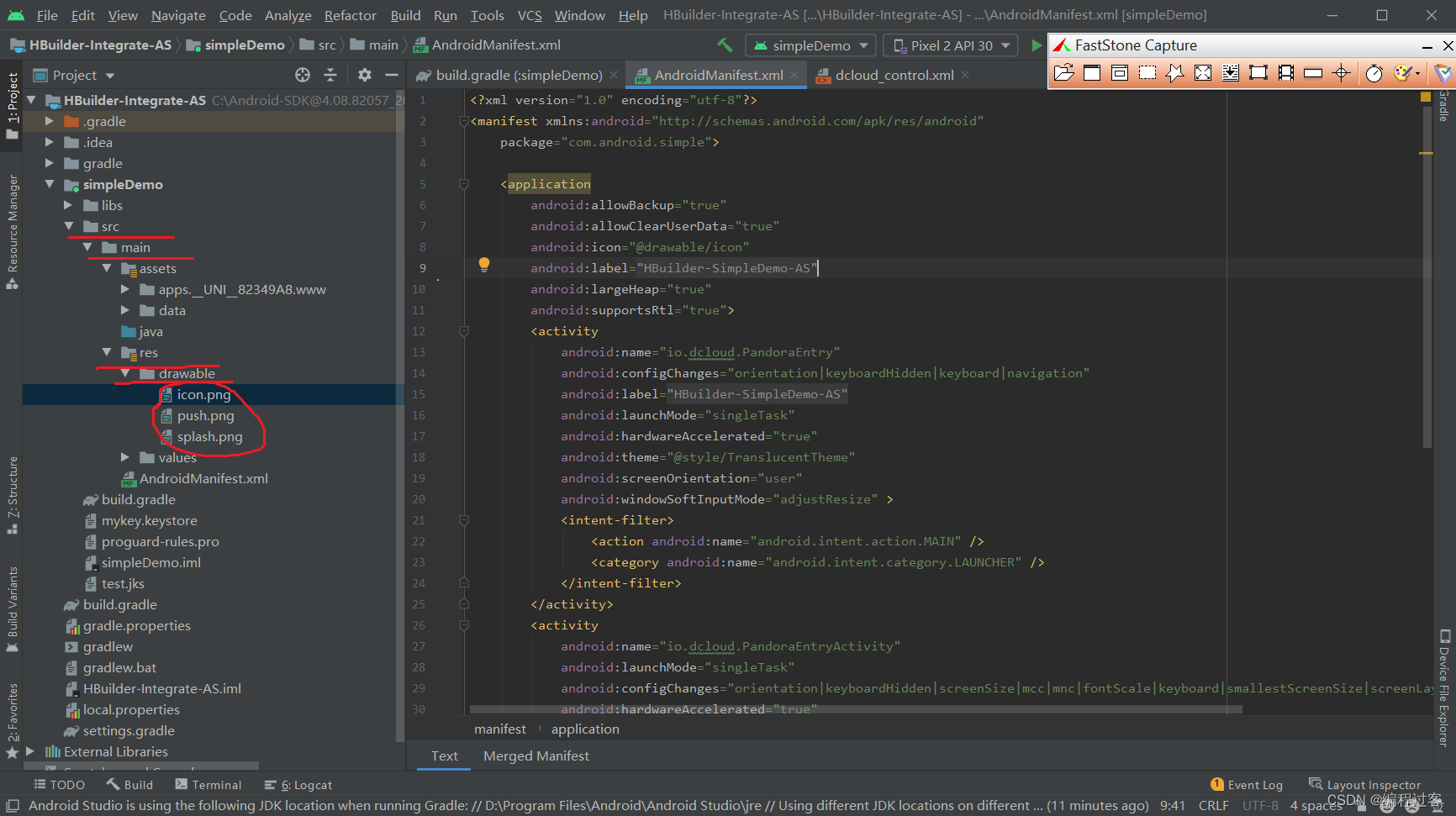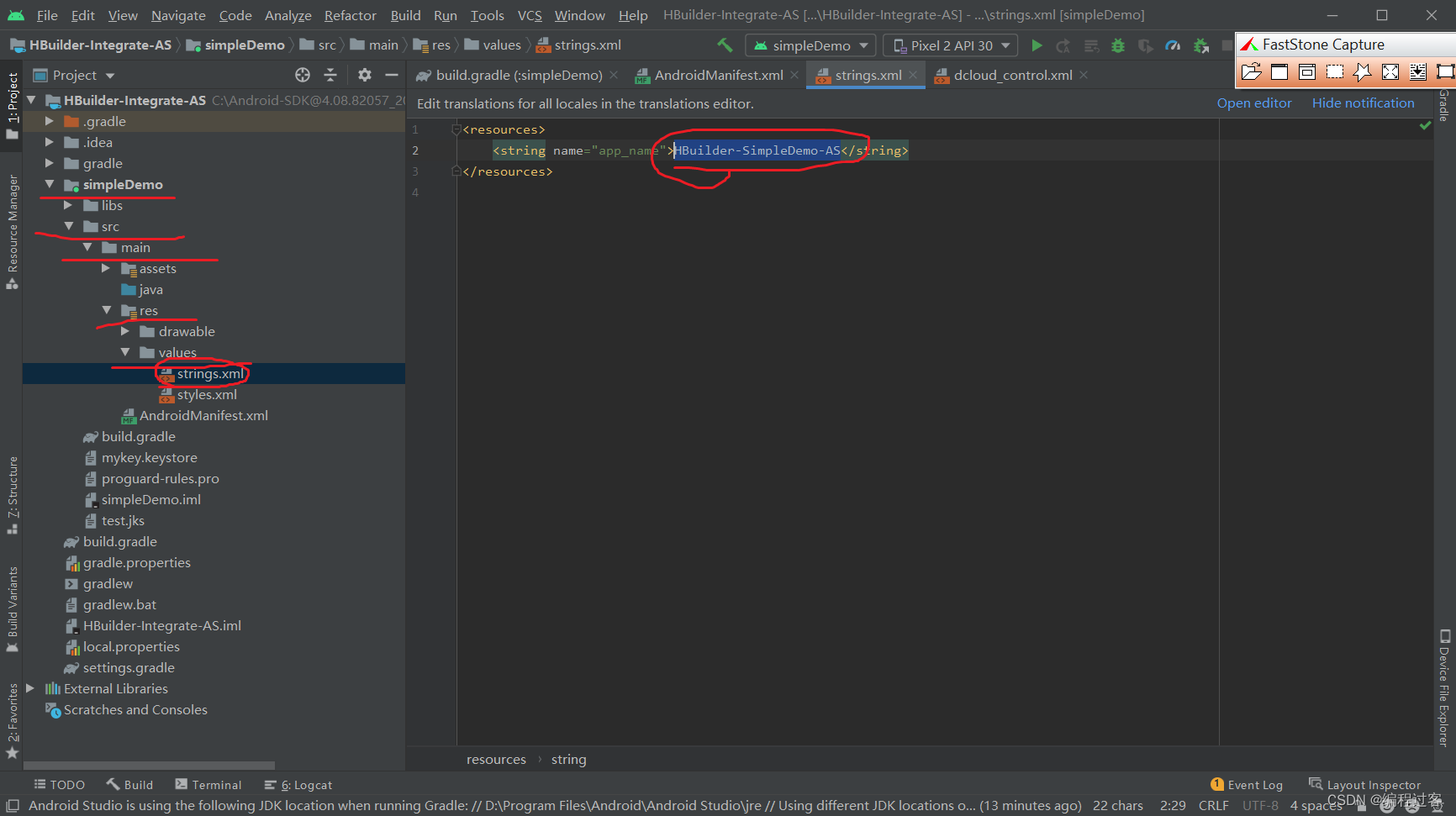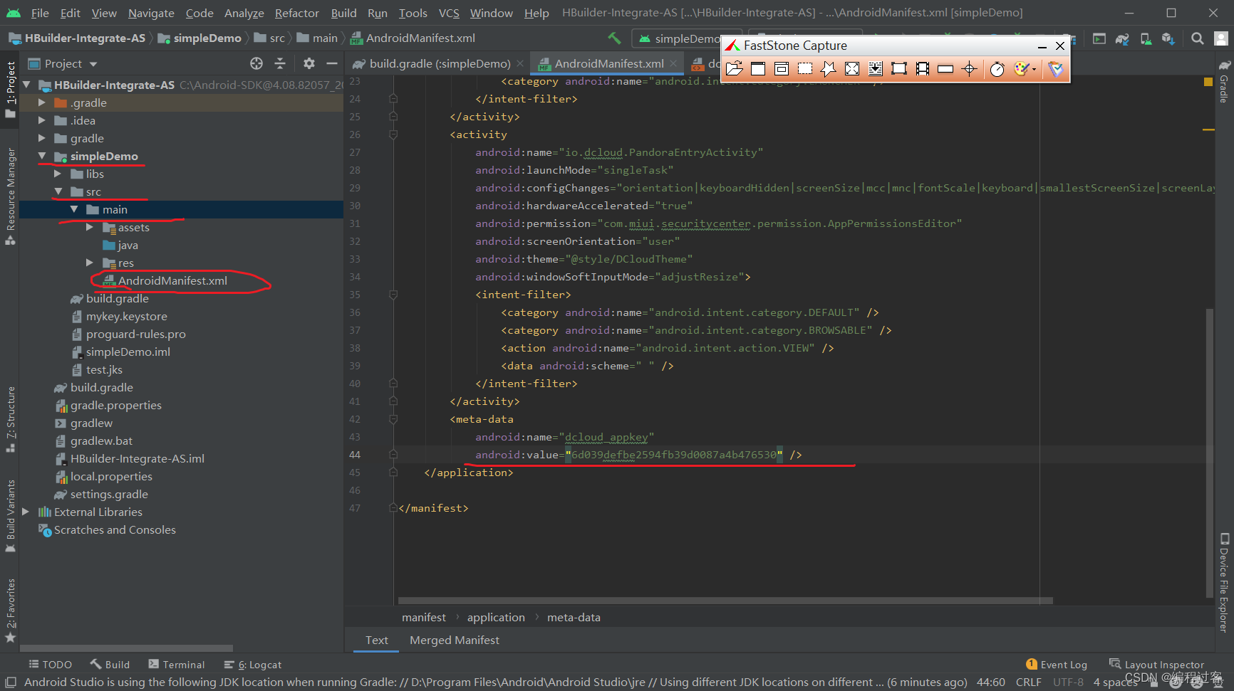 打开simpleDemo项目里的src->main->AndroidManifest.xml文件,将里面的value替换为对应