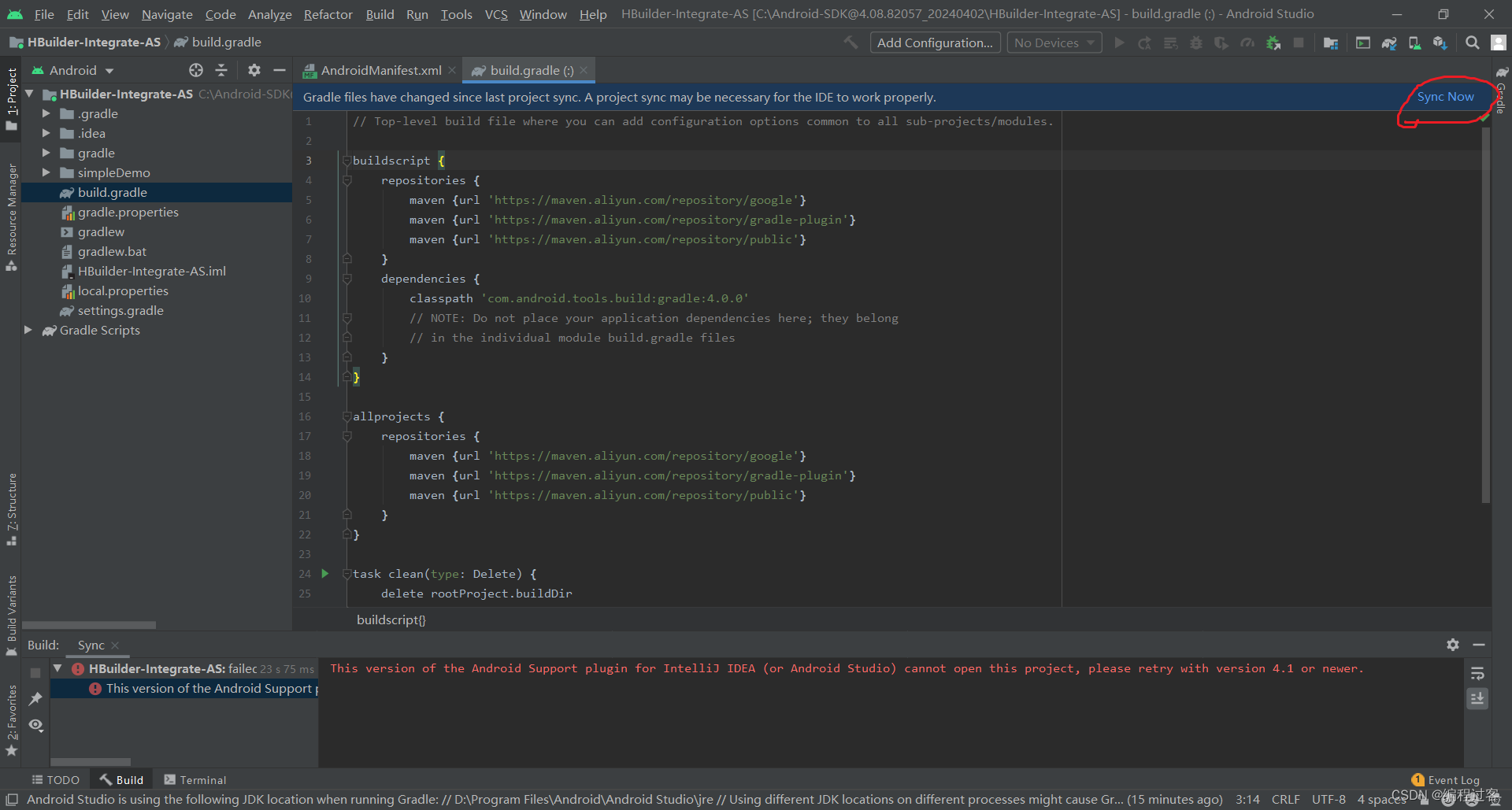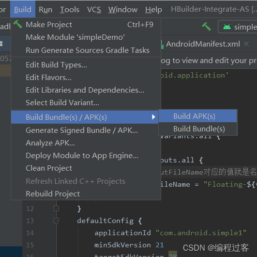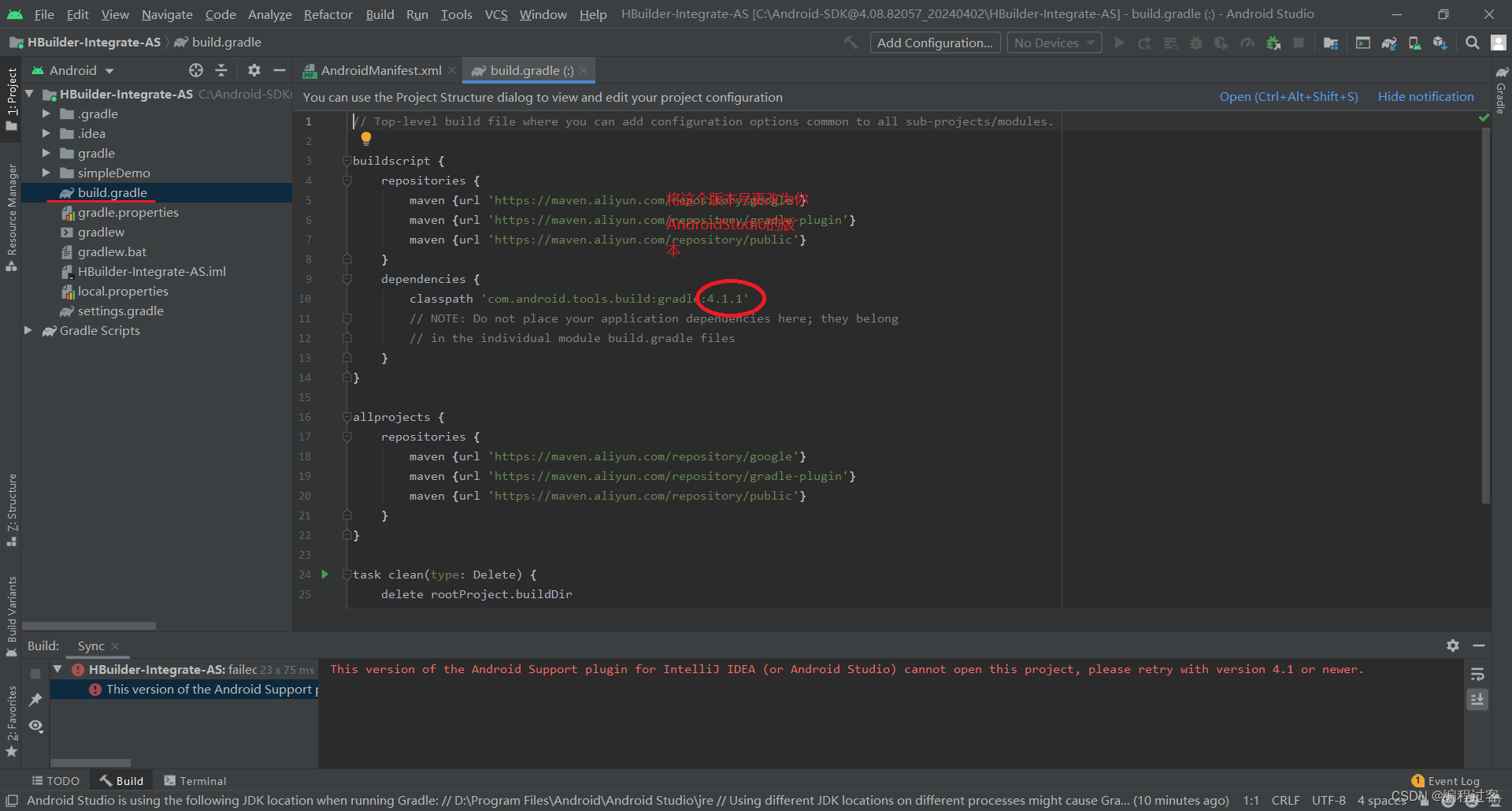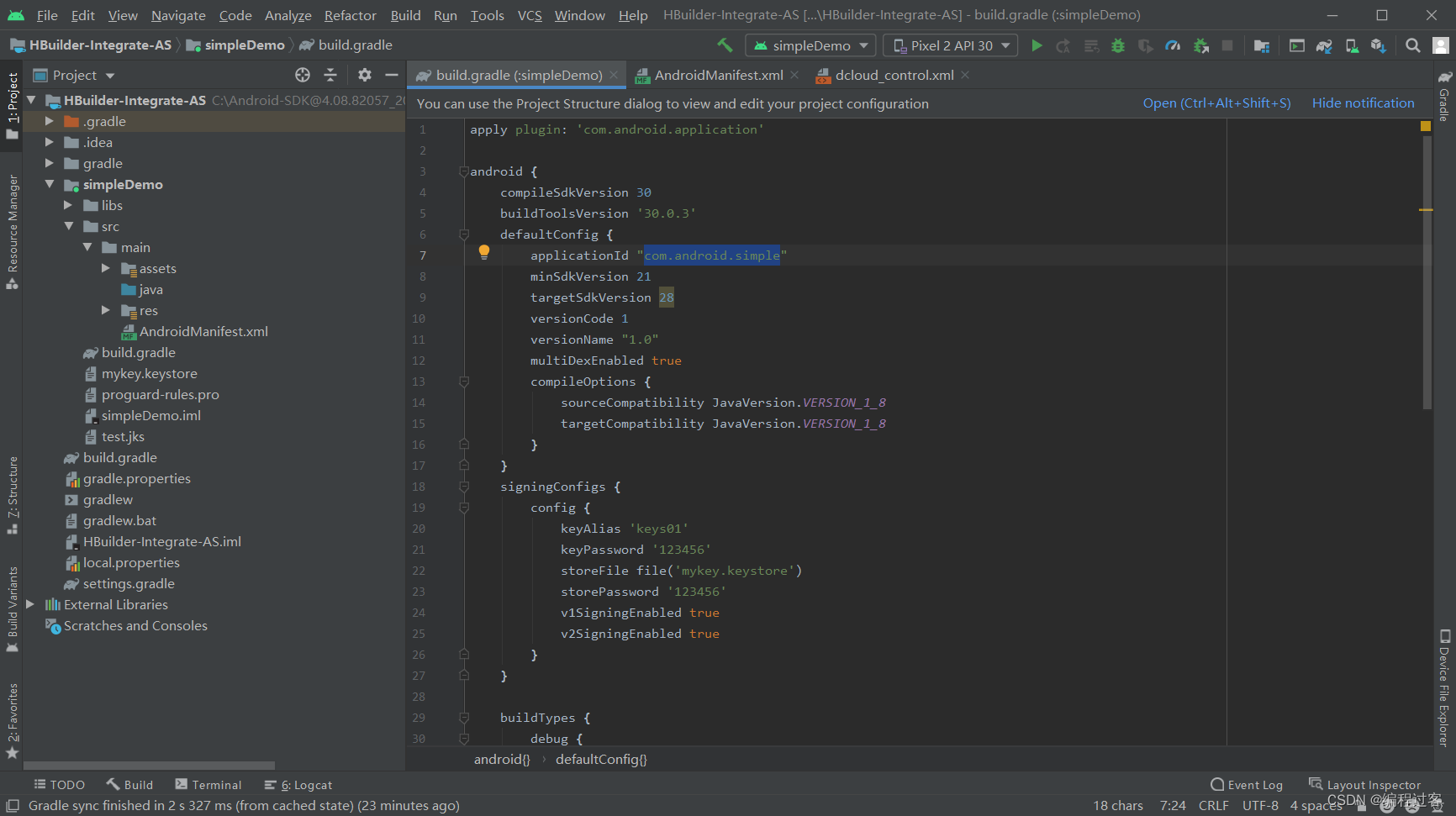 先将项目结构更改为Project这样子更好找文件,找到simpleDemo文件夹下的build.gradle,并修改以下配置,修改完成后点击右上角重新构建
