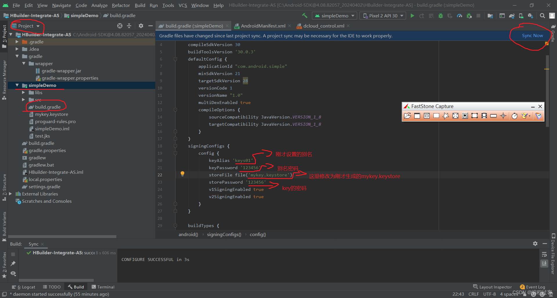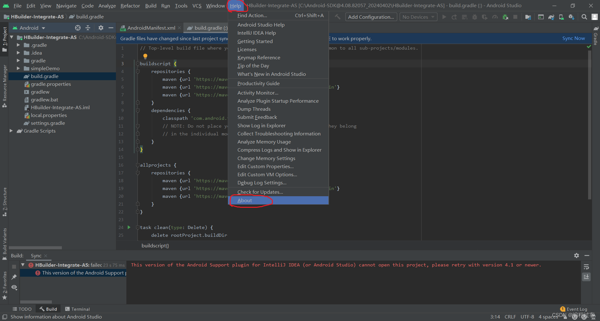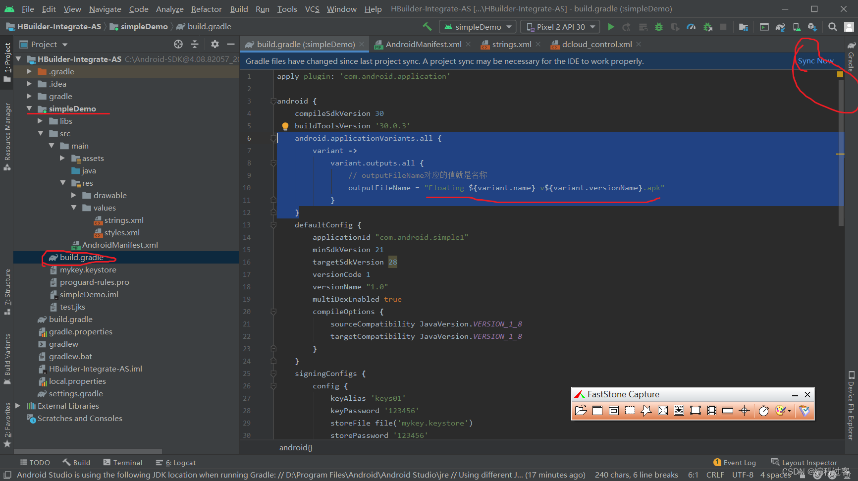 先将项目结构更改为Project这样子更好找文件,找到simpleDemo文件夹下的build.gradle,并修改以下配置,修改完成后点击右上角重新构建