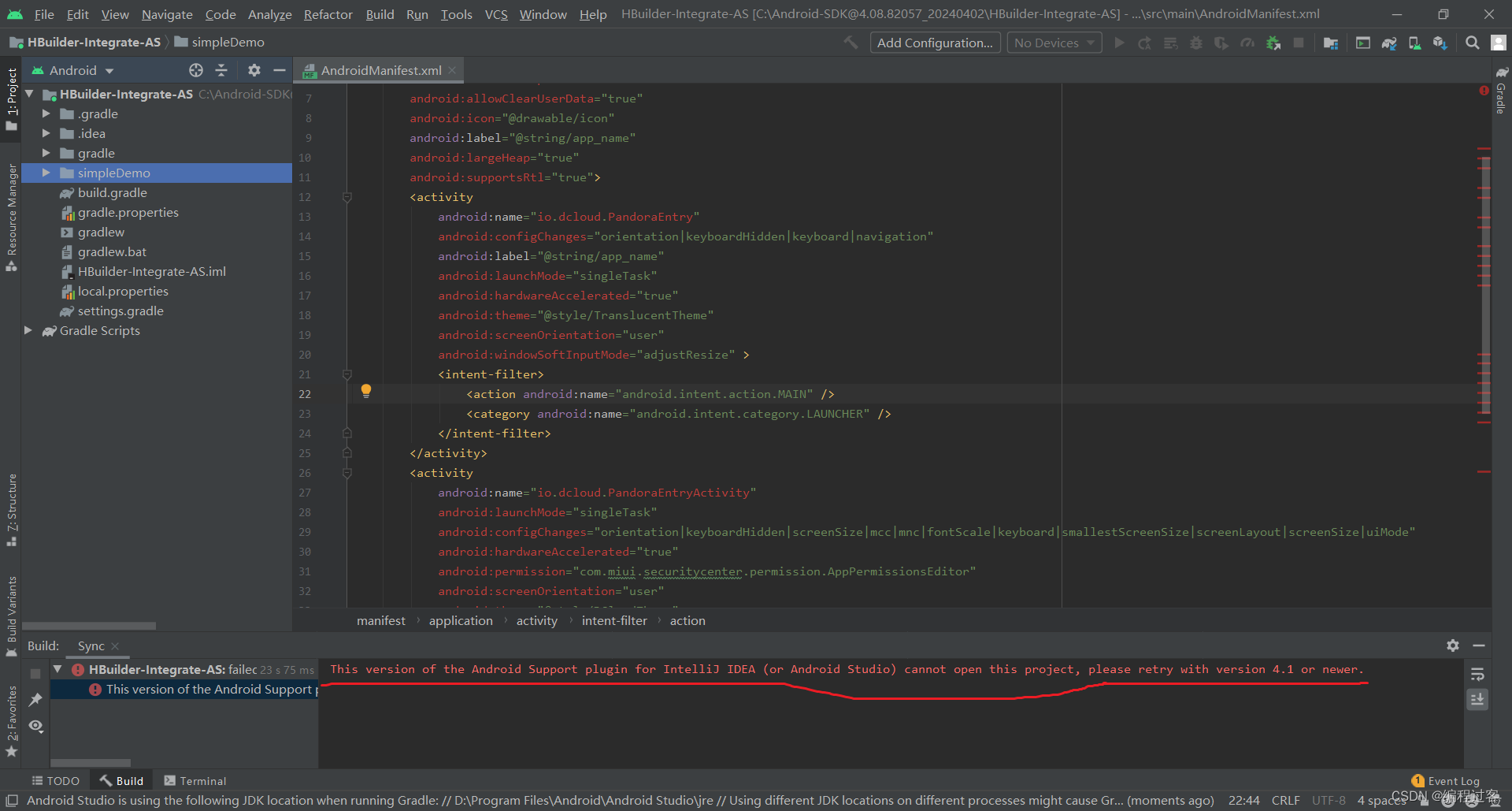 这个是当前的AndroidStudio版本与离线SDK的指定版本不匹配,解决方法是修改配置:
